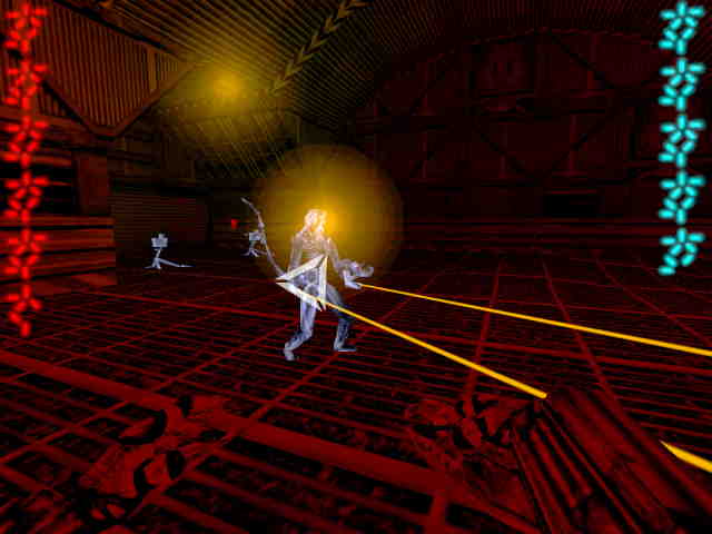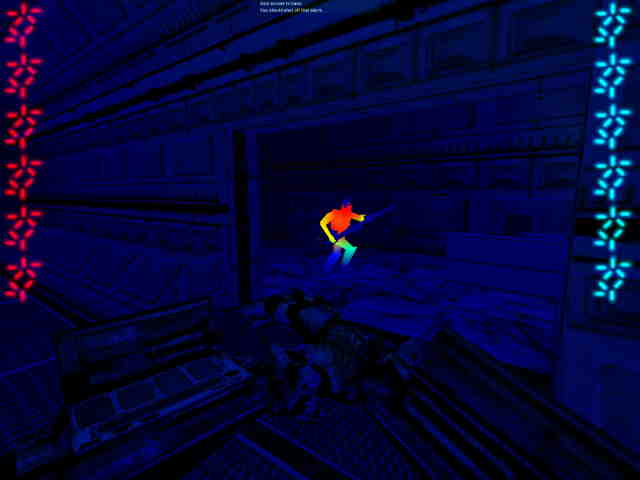 vidění (vidíte vše červeně), vytáhněte pistoli a