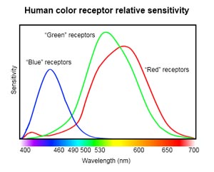 Lidské oko není schopné vnímat celé spektrum světla. Když takové širokospektrální světlo dopadne na čípky, dráždí čípky různou intenzitou podle toho, na které pásmo je který čípek nejcitlivější. Jsou 3 druhy čípků, nejcitlivější v pásmu kolem červené barvy, zelené barvy a modré barvy, v rozsahu viditelné části spektra tj. asi 380 až 750 nm. Vzájemným porovnáváním intenzit dráždění čípků pak mozek vyhodnocuje barvu. Všimněte si vlevo na grafu malého hrbolku červené složky - tento hrbolek je zodpovědný za to, že vnímáme "opravdovou fialovou" jako fialovou a ne jako modrou.