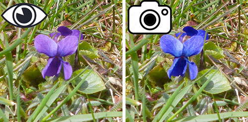 Tedy - mohou být fialové barvy, které kamera vezme stejně jako oko, ale mohou být fialové barvy, které stejná kamera vezme jako modrou, přestože oko vidí fialovou. A to proto, že barvy v reálném světě nejsou tři RGB složky (tak jak je vnímáme okem), ale široké spektrum kmitočtů.