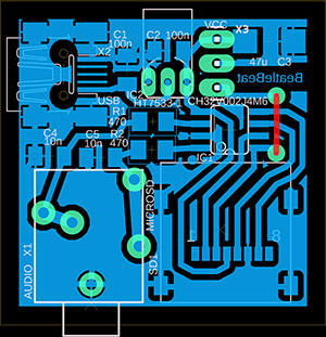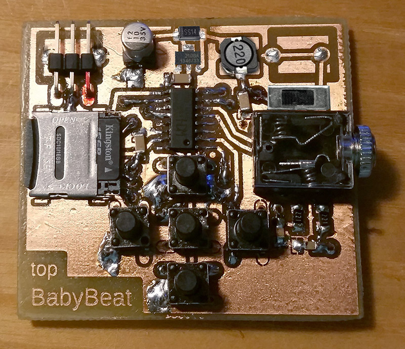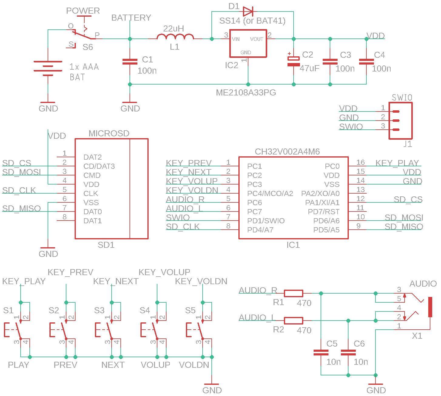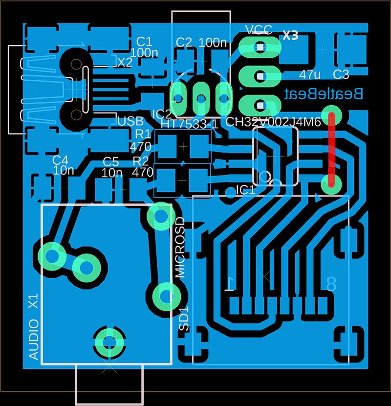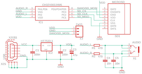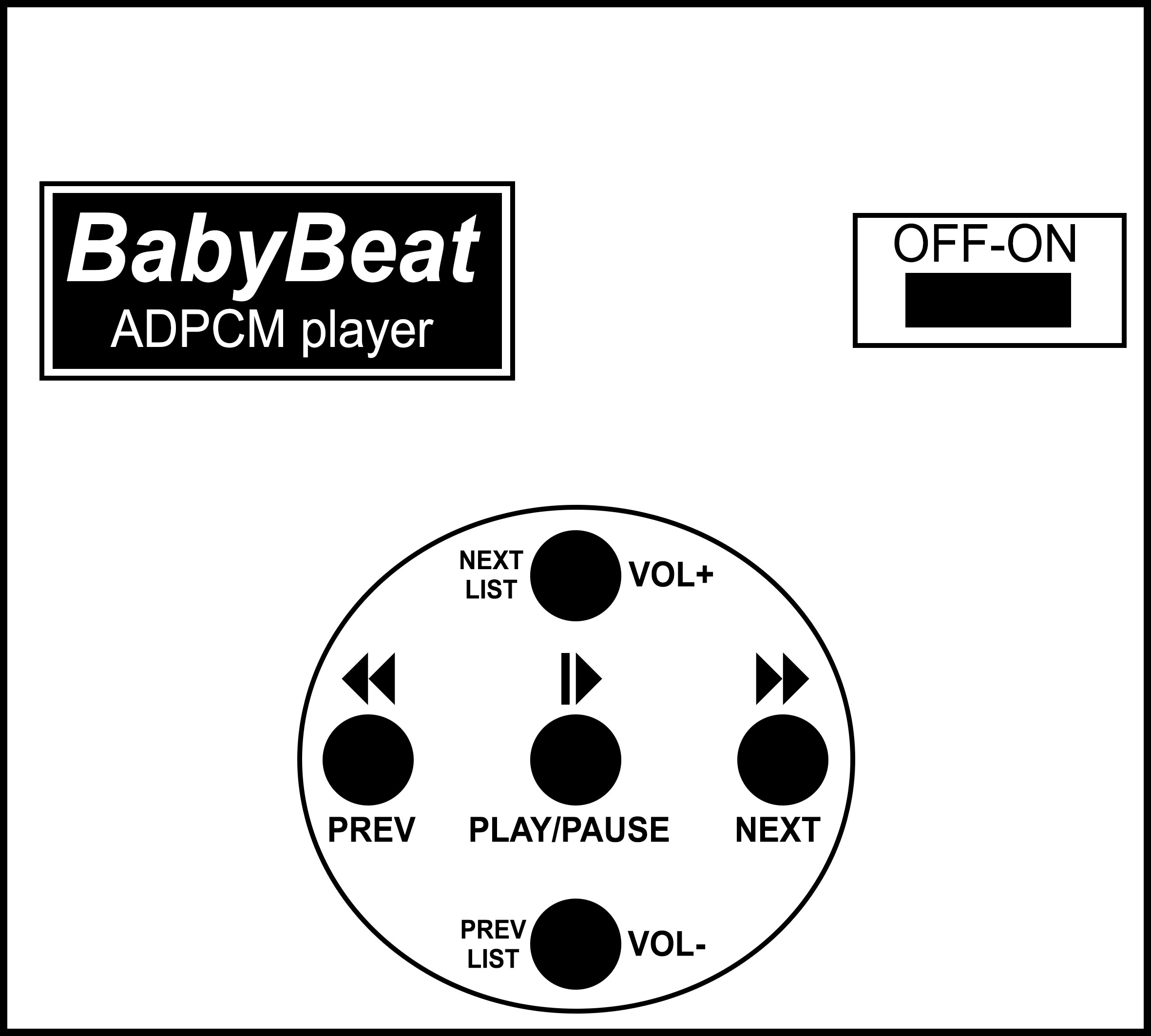 BabyBeat a BeatleBeat je stereofonní mini-přehrávač hudebních souborů z SD karty - "ImaPlayer". BabyBeat je verze s 5 tlačítky, procesorem CH32V002A4M6, napájením z baterie AAA 1,5V a měničem napětí na 3,3V. BeatleBeat je minimalistická verze s procesorem CH32V002J4M6 a napájením z USB se stabilizátorem na 3,3V. Napájení přehrávačů slouží jen jako příklad, jistě si každý upraví napájení podle svých představ. Připomínám, že procesor je sice možné provozovat na 5V, ale SD karta vyžaduje napětí 3,3V. Pokud budete u některých SD karet pozorovat rušení (vrčení), lze ho redukovat zvětšením kapacity kondenzátoru v napájení. Implicitní hlasitost můžete upravit změnou rezistorů R1 a R2.