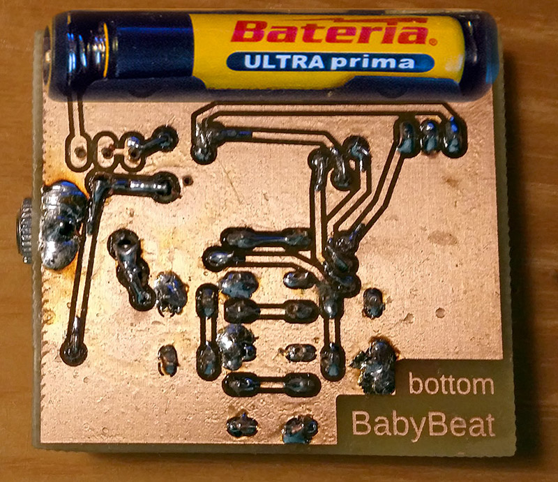 Na horní straně plošného spoje je umístěno pouze 7 LED, všechny ostatní součástky jsou přiletovány zespodu plošného spoje. V prototypu jsem namísto jedné vrstvy plošného spoje použil drátové propojky. Vy jistě použijete oboustranný plošný spoj. Jako aktivační mikrospínač jsem použil TS6604B-7.0 s délkou hmatníku 3.5mm. Po stranách jsou zespodu přilepeny 2 vrstvy molitanového těsnění pro odpružení, aby kostka stála rovně na stole a přitom se dala snadno zmáčknout. Horní štítek jsem vytiskl na inkoustové tiskárně, přilepil a přelepil izolepou. Zřejmě použijete potisk plošného spoje. Při letování držáku baterie pozor ať nevznike zkrat s prostřední LED - případně držák baterie v tom místě mírně přihněte. Jde-li baterie zasunout příliš těžko, odehněte přítlačná pérka držáku baterie.