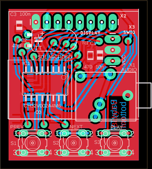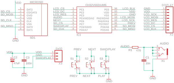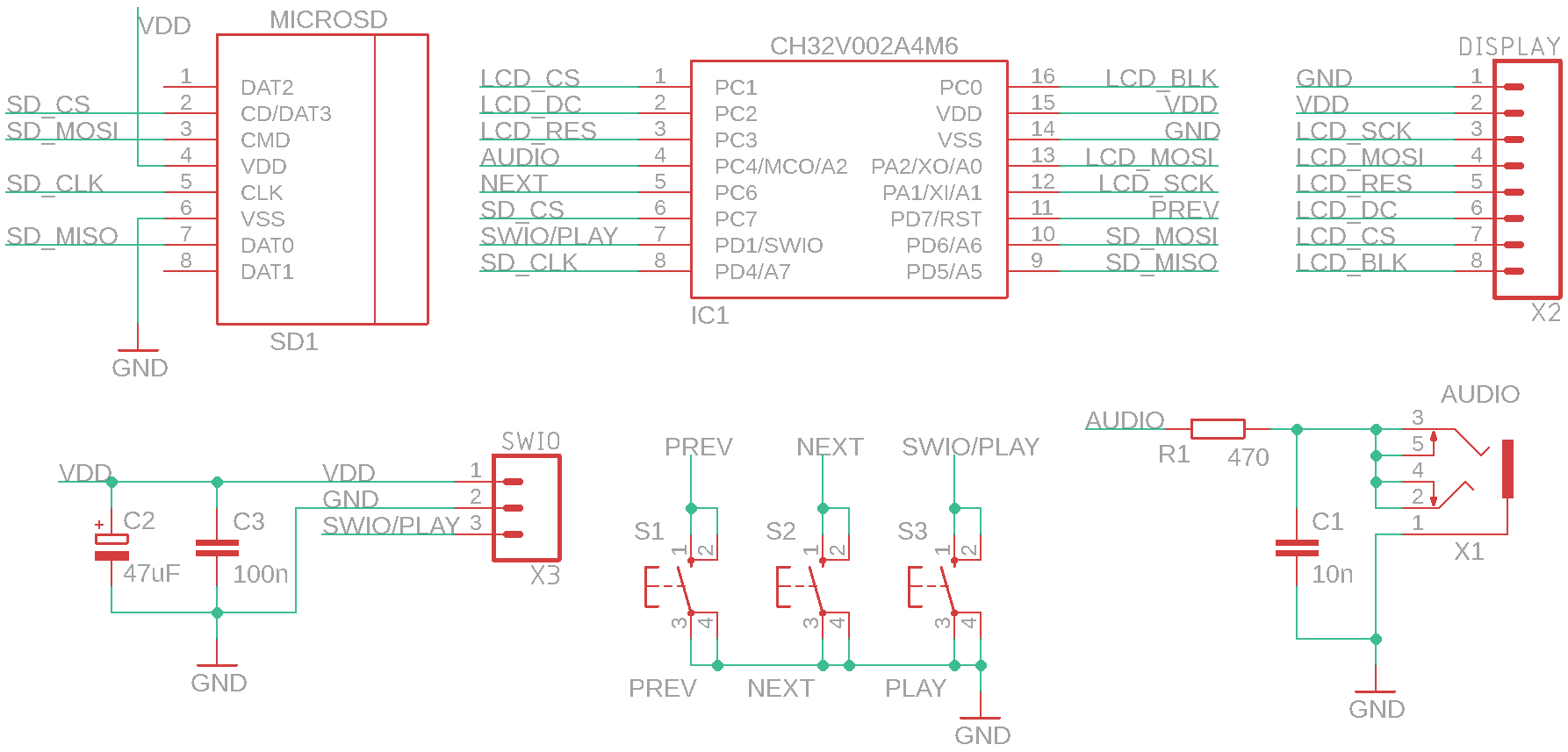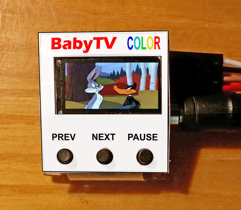 BabyTV je miniaturní přehrávač videí z SD karty, s procesorem CH32V002A4M6 a barevným displejem SPI LCD 160x80 pixelů. Jako displej je použit LCD IPS 0.96" ST7735S SPI displej, rozlišení 160x80 pixelů, controller ST7735S, napětí 3.3V ( https://pajenicko.cz/komponenty/displeje/barevny-displej-ips-0.96-80x160-st7735s-spi ). Přehrávač obsahuje kromě displeje pouze 3 ovládací tlačítka, slot na mikroSD kartu, audio konektor, 1 rezistor a 2 kondenzátory. V prototypu se neřeší napájení - přehrávač je napájen z externího zdroje 3.3V (programátor). Jako zdroj lze použít např. monočlánek 1.5V s měničem napětí ME2108 3.3V ( https://pajenicko.cz/miniaturni-menic-napeti-step-up-me2108-0.9v-3.3v-na-3.3v-az-400ma ) nebo akumulátor 3.7V s lineárním stabilizátorem 3.3V.