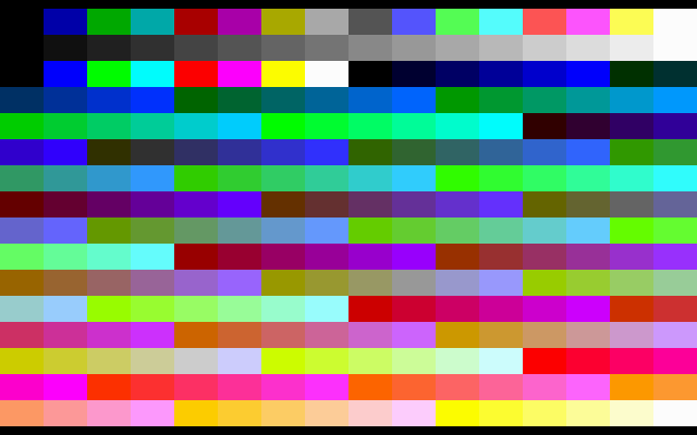 VGAPAL - zobrazení standardních palet VGA. Litos8 může použít integrovanou tabulku uniformních palet VGA s rozložením: 16 standardních barev EGA, 16 odstínů šedé, 8 kontrastních barev RGB a 216 uniformních barev, kde každá složka RGB má 6 odstínů (tedy uniformní paleta = 40 + B*6/256 + G*6/256*6 + R*6/256*6*6).