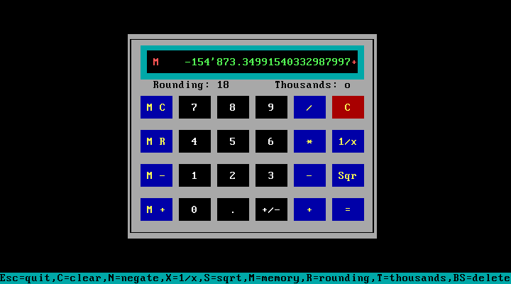 CALC - kalkulátor. Výpočty probíhají s pevnou desetinnou tečkou, s přesností 74 číslic pro celou část a 74 číslic pro desetinnou část. Na displeji se zobrazí max. 30 číslic. K dispozici jsou 4 základní operace, odmocnina, převrácená hodnota a paměťový registr. Volitelný počet zobrazených desetinných míst a oddělení řádů tisíců. Aktuální stav se při ukončení uchovává do konfiguračního souboru.
