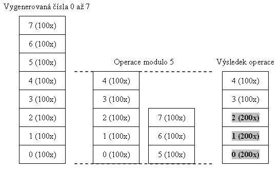 Představme si fiktivní situaci, kdy máme k dispozici lineární generátor s rozsahem hodnot 0 až 7. Provedli jsme 800 pokusů a každá z 8 hodnot byla vygenerována 100x. Z vygenerovaných čísel chceme vytvořit náhodná čísla s rozsahem hodnot 0 až 4 (tedy 5 hodnot). Případnou operaci s dělením si můžeme představit tak, jako bychom sloupec možných hodnot obtočili kolem trubky s šířkou rovnou děliteli (tj. od čísla opakovaně odečítáme dělitele, až se číslo dostane do požadovaných mezí). V tomto případě zůstane poslední otáčka neúplná a jak vidíme na obrázku, jednotlivá čísla nemají stejnou pravděpodobnost výskytu (čísla 0 až 2 mají mnohem větší četnost, 200x).
