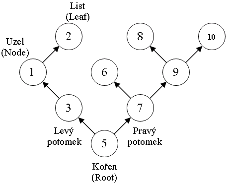 Základem binárního stromu je kořen (root). Každý prvek stromu se nazývá uzel (node). Každý uzel má svou hodnotu - třídicí klíč. Z uzle mohou vycházet další dvě větve - levý a pravý potomek (child), uzel je pro potomky rodičem (parent). Uzel, ze kterého nevychází další větve, se nazývá listem (leaf). Platí, že všechny uzly s menší hodnotou klíče leží v levé větvi a všechny uzly s větší hodnotou klíče v pravé větvi. Dva uzly nemohou mít stejnou hodnotu klíče. Je-li potřeba vyhledat uzel s určitou hodnotou klíče, vychází hledání z kořene stromu. V každém uzlu je porovnána hodnota klíče uzlu s hledanou hodnotou klíče. Je-li hledaný klíč menší, pokračuje se dále levou větví (levým potomkem). Je-li hledaný klíč větší, pokračuje se pravou větví. Je-li klíč shodný, požadovaný uzel byl nalezen. Pokud v daném směru nenavazuje další potomek, hodnota klíče nebyla nalezena.