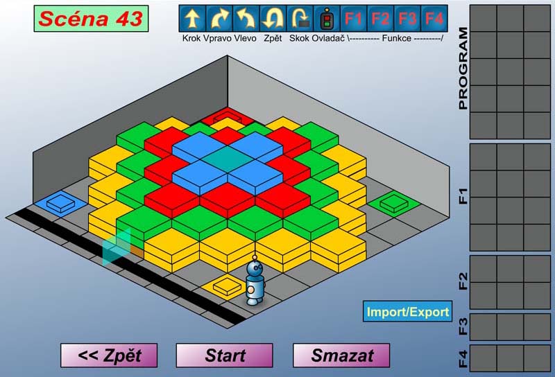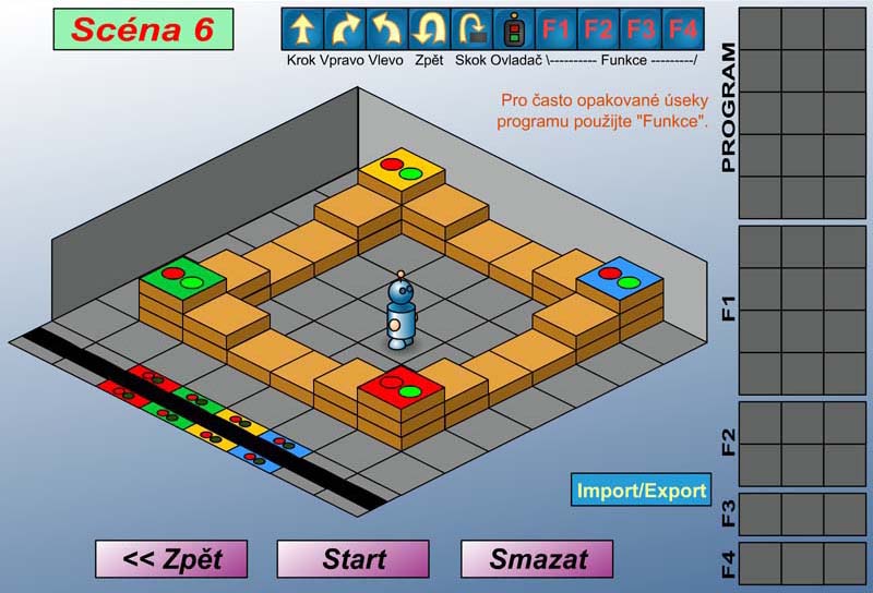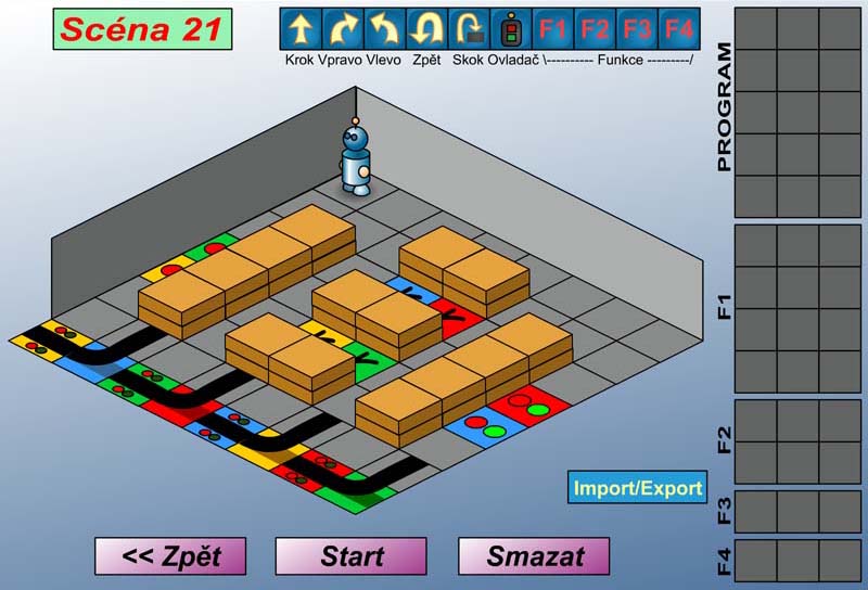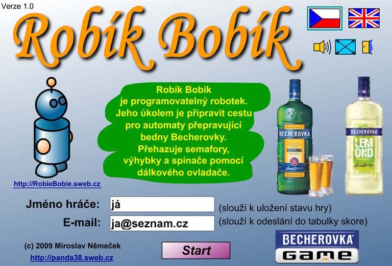 Robík Bobík je programovatelný robotek. Jeho úkolem je připravit cestu pro automaty přepravující bedny Becherovky. Přehazuje semafory, výhybky a spínače pomocí dálkového ovladače. |