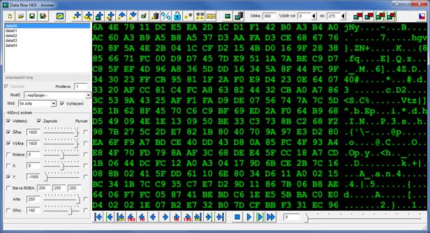 Tato animace roluje obrazem s dlouhým textem - řada 0 a 1 jako v Matrix, simulace HEX výpisu programu, rolování fiktivního novinového článku.