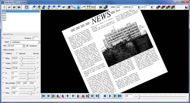 Nejdříve jsem vygeneroval rolující noviny. Pak jsem chtěl ještě klasickou variantu animace, kde bych podkladové obrázky využil - noviny narotují do obrazovky, pak se převrátí pár stránek a noviny zas odrotují pryč. Vytvořil jsem novou scénu a pro obrázky jsem použil následující nastavení transformací (pořadí obrázků jde zdola nahoru, první obrázek je v seznamu dole a poslední nahoře).
