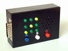 | Základní periferní jednotkou je univerzální modul P84-UNI. Jednotka je určena především k výukovým účelům a k seznámení se s procesorem. Obsahuje matici 3x3 svítivých LED diod, 3 tlačítka a reproduktor. Pro tuto jednotku je určeno 7 výukových lekcí, s jejichž pomocí je možné seznámit se s programováním procesorů řady PIC16xxx. |