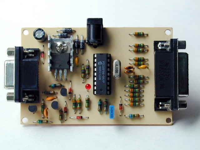 Osazování začněte konektory. Nejchoulostivější součástkou je napájecí konektor. Jeho vývody jsou poniklované a je proto nutno k pájení použít přípravek k pájení niklu nebo kontakty před pájením obrousit a pocínovat. Pozor - konektor je z lehce tavitelné umělé hmoty a je proto nutno pájet krátce. Jako další osaďte konektory CANNON. Důkladně je zamáčkněte do spoje a přiletujte nejdříve zemnící vodiče a až potom všechny ostatní piny. Dále připevněte stabilizátor s chladičem, před montáží pocínujte plošný spoj v okolí díry pro šroubek jako dosedací místo podložky pod matkou. Nyní můžete osazovat ostatní součástky. Pozor na správnou polaritu elektrolytického kondenzátoru (kladný pól má delší vodič a jeho záporný pól je na pouzdru označen proužkem) a diod (katoda je označena proužkem na pouzdru). Při montáži tranzistorů použijte orientaci podle obrázku. LED diodu ponechejte asi 10 mm nad povrchem spoje. Anoda LED diody (kladný pól) je označena delším vývodem. Pro procesor osaďte pouze patici, samotný procesor vložte do patice až po kompletním osazení celé jednotky. Pozor na správnou orientaci patice i procesoru (značka je na straně vývodů 1 a 18). U součástek, u kterých nezáleží na orientaci, dodržujte orientaci tak, aby jejich popisy byly čitelné při pohledu zdola nebo zleva. Odpory při osazování kontrolujte ohmetrem. Barevné proužky nemusí být dobře rozpoznatelné a mohlo by tak dojít snadno k záměně odporů. Nebezpečí záměny hrozí především u odporů 5k6 a 56k. Krystalu ponechejte delší vývody a pájejte jej krátce, při přehřátí by mohlo dojít k jeho poškození.