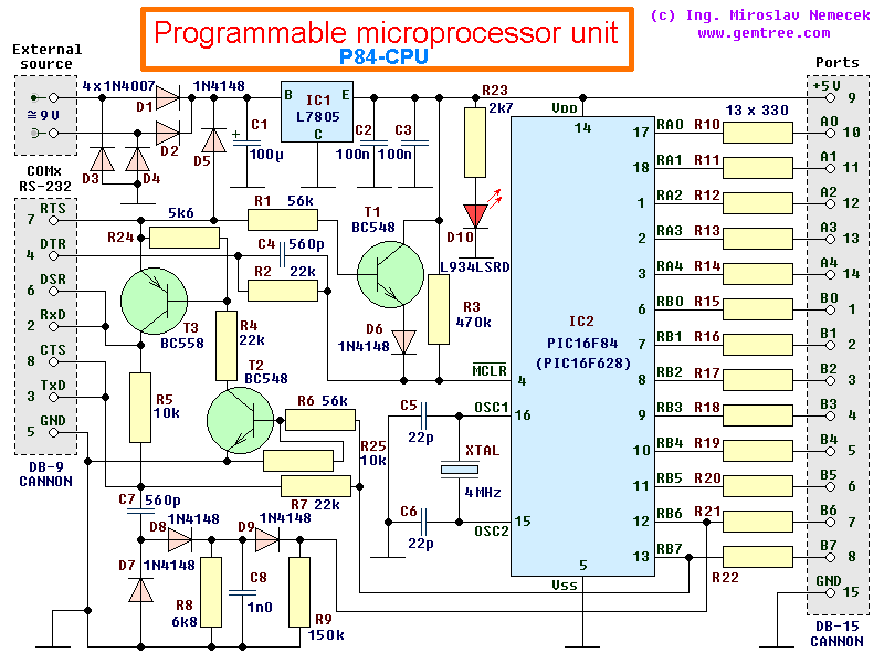 Signál DTR z konektoru COMx aktivuje mód programování procesoru. Spolu se signálem RTS určují 3 stavy procesoru: RESET (oba signály jsou vypnuty), běžný provoz (DTR je vypnut, RTS zapnut) a programování (DTR i RTS jsou zapnuty). Odpor R3 zajišťuje běžný provoz procesoru v případě, že modul je odpojen od počítače. Signálem TxD jsou během programování zapisována data do procesoru. Od signálu jsou přes kondenzátor C7 odvozovány hodinové impulsy. Tranzistory T2 a T3 zajišťují převod výstupního signálu z procesoru na úrovně RS-232. Při normálním provozu je možné pomocí signálů TxD, RxD a RB7 komunikovat mezi procesorem a počítačem v poloduplexním režimu. Upozornění: Modul nelze používat s COM porty, jejichž výstupní napětí je menší než 11.5 V (některé notebooky používají 9V nebo i méně).