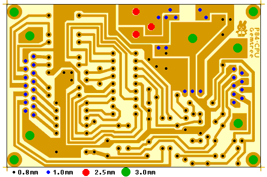 Všechny díry vyvrtejte nejdříve vrtákem 0.8 mm. Poté převrtejte díry s větším průměrem podle následujícího obrázku. Po vyvrtání děr začistěte otřepy děr větším vrtákem (lehkým otáčením v ruce). Ořežte lupénkovou pilkou spoj na správnou velikost a okraje zarovnejte pilníkem. Omyjte z desky fotocitlivou vrstvu (lihem nebo benzinem), měděné plochy očistěte měkkou gumou a nalakujte plošný spoj pájecím lakem (roztok kalafuny v lihu).