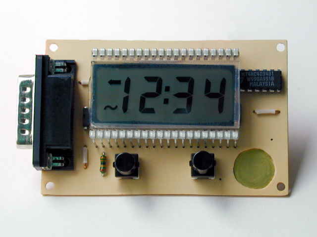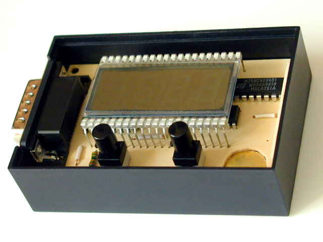 Používáte-li novější typ displeje s krátkými vývody nebo pokud budete chtít mít možnost výměny displeje (za cenu nižší spolehlivosti než při zaletování a vývody budete muset možná zkrátit), zaletujte do plošného spoje 2 jednořadé patice SIL 20. Použijete-li jednu patici DIL 40 (je levnější), rozstřihněte nejdříve spojovací můstky uprostřed (jinak by mohla objímka prasknout) a až potom je odstřihněte na koncích a zbytky upilujte. Při zasouvání displeje do objímky zatlačujte střídavě jednu a druhou řadu vývodů. Celoplošné zatlačení by displej možná nemusel přežít. Budete-li displej letovat, zkontrolujte naposledy správnost osazení ostatních součástek, po přiletování displeje již nebude snadné provádět nějaké změny. Zasuňte displej do děr a nastavte výšku jeho horní plochy nad povrchem plošného spoje na 11 mm. Přiletujte displej v rozích, znovu zkontrolujte jeho výšku a displej přiletujte celý.