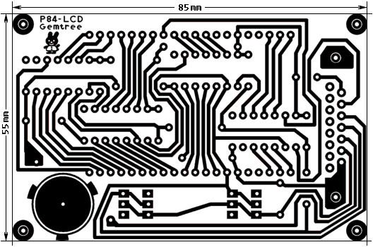 Všechny díry vyvrtejte nejdříve vrtákem 0.8 mm. Poté převrtejte díry s větším průměrem podle následujícího obrázku. Po vyvrtání děr začistěte otřepy děr větším vrtákem (lehkým otáčením v ruce). Ořežte lupénkovou pilkou spoj na správnou velikost a okraje zarovnejte pilníkem. Lupénkovou pilkou vyřízněte i otvor pro piezoreproduktor (předvrtejte v otvoru díru pro nasazení plátku pilky). Omyjte z desky fotocitlivou vrstvu (lihem nebo benzinem), měděné plochy očistěte měkkou gumou a nalakujte plošný spoj pájecím lakem (roztok kalafuny v lihu).