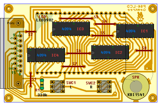 Nyní osaďte odpor, drátové propojky S1 až S8 a pokračujte tlačítky. Při pájení tlačítek dejte pozor na to, aby pájecí voda nebo kalafuna nezatekla dovnitř do tlačítek, tlačítka by se mohla stát nefunkční nebo v lepším případě by při stisku "lepily" kontakty. Dále osaďte integrované obvody IC1 až IC4. Jedná se o obvody typu CMOS, tedy obvody řízené napětím, které mohou být snadno zničeny elektrostatickým nábojem. Pro práci s nimi platí mnoho bezpečnostních pravidel, uvedeme si alespoň pár zásad: Obvody CMOS uchovávejte vždy ve vodivém pouzdru nebo na vodivé podložce z alobalu. Před uchopením obvodu se nejdříve "vybijte" např. dotykem na zeď, potom se dotkněte vodivého obalu s obvodem a až potom obvod uchopte. Pokud možno se vývodů obvodu nedotýkejte. Je-li obvod zasunut do plošného spoje, je již chráněn trochu lépe, ale i tak se při použití transformátorové páječky snažte páječku zapínat a vypínat ne během dotyku s vývodem obvodu, aby nedošlo k průrazu napěťovým impulsem vzniklým při zapínání a vypínání páječky.