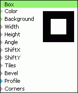 Profile - vstup průběhové křivky určující průběh úkosu hrany. Pro souřadnici X průběhové křivky je použita hodnota z úkosu hrany (tj. 0=pozadí, 1=popředí). Hodnota zjištěná z křivky se použije jako stupeň prolnutí barvy popředí a pozadí. Hodnota pro X=0 se použije pro pozadí kolem obdélníku a hodnota pro X=1 se použije pro popředí uvnitř obdélníku, a to i mimo úkos hrany.