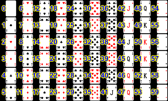 Card - číslo karty, určené hodnotou od 0 po krocích 0.01. Pořadové číslo karty = barva + hodnota*4 - 3. Barva je 0=piky, 1=srdce, 2=káry, 3=kříže. Hodnota je 1=eso, 2=dvojka, ... 13=král. K základní sadě 52 karet je doplněna karta s číslem 0, která je prázdná, a na konci (až po 100) opakující se čtveřice karet se symbolem barvy, ale bez hodnoty.