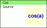 Source - obrazový vstup. Ze složek signálu je vypočtena funkce kosinus tak, že rozsah vstupu 0..1 odpovídá úhlu 0..360° a výstup je převeden do rozsahu 0..1 se střední hodnotou 0.5. Vstup není ohraničen.