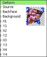 Filtr "Deform" deformuje obraz pomocí 4 nezávislých vrcholů. Zadní strana obrazu může obsahovat jiný obraz než přední strana. Filtr působí opačně než filtr Enform. Souřadnice představují místa, kam budou vrcholy vstupního obrazu umístěny ve výstupním obrazu, čímž lze vstupní obraz zmenšovat.