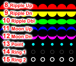 Size1..Size8 - velikost vzorku. Tento parametr má několik významů. Je rozdělen na 10 úseků. Číslo úseku s krokem 0.1 určuje počet opakování vzorku. Např. rozsah 0.91..1.0 opakuje vzorek 1x, rozsah 0.81..0.9 opakuje 2x až po rozsah 0.01..0.1, který opakuje 10x. Směrem nahoru je rozsah ohraničen hodnotou 1 (tj. minimální opakování je 1x), ale směrem dolů ohraničen není, tj. lze zadat i větší počet opakování než 10x. Rozsah jedné desetiny čísla je rozdělen na 2 úseky - pro nižší polovinu začíná vzorek na sudé poloze (tj. na přelomu okrajů), pro vyšší polovinu na liché poloze. Zbývající rozsah jedné poloviny desetiny čísla určuje velikost symbolů vzorku. Není však nutné se omezovat jen na 5 kroků setin čísla, jemnějším posunem lze velikost regulovat jemněji. Parametr Size funguje odlišně pro výplň Line - v tomto případě definuje šířku vykreslené čáry v plném rozsahu 0..1.