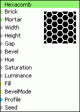 Profile - vstup průběhové křivky určující průběh úkosu hrany. Pro souřadnici X průběhové křivky je použita hodnota z úkosu hrany (tj. 0=malta, 1=cihly). Hodnota zjištěná z křivky se použije jako stupeň prolnutí barvy cihel a malty. Hodnota pro X=0 se použije pro mezeru mezi cihlami a hodnota pro X=1 se použije pro obsah cihel, a to i mimo úkos hrany.