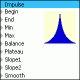 Filtr "Impulse" je generátor impulzové křivky. Výstupní hodnota filtru je závislá na horizontální souřadnici X. Souřadnice X, vstupy i výstupní hodnota jsou typicky v rozsahu 0..1.