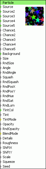 Filtr "Particle" je částicový generátor, umožňující náhodně rozložit obrazové symboly po ploše. K dispozici je 5 vstupů pro různé typy symbolů. Každý z 5 typů symbolů může být generován s různou náhodností. Přes základní vrstvu symbolů se mohou překreslovat další vrstvy s dvojnásobně rostoucí frekvencí (a polovičním měřítkem) - oktávy. Při generování symbolů se vygeneruje počet symbolů daný nejvyšší hodnotou vstupů Chance1..Chance5. Zastoupení jednotlivých symbolů se poté rozdělí mezi symboly v poměru odpovídajícím vzájemnému poměru vstupů Chance1..Chance5. Pro některé vstupy (změna barvy, velikost, otočení) se nepoužije skutečná souřadnice ve výstupním obrazu, ale souřadnice středu symbolu. Díky tomu je možné řídit vlastnosti generovaných symbolů, aniž dojde k jejich nechtěné deformaci nebo nerovnoměrnému zbarvení. Alfa složka výstupního obrazu má hodnotu 1 (=plné krytí). Po sestavení signálu se výstupní signál omezí do normovaného rozsahu 0..1. K filtru lze připojovat další doplňkové filtry, umožňující další řízení generování symbolů - ParticleX, ParticleY a ParticleRnd.