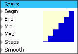 Filtr "Stairs" je generátor schodovité křivky. Výstupní hodnota filtru je závislá na horizontální souřadnici X. Souřadnice X, vstupy i výstupní hodnota jsou typicky v rozsahu 0..1.