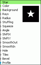 Profile - vstup průběhové křivky určující průběh úkosu hrany. Pro souřadnici X průběhové křivky je použita hodnota z úkosu hrany (tj. 0=pozadí, 1=popředí). Hodnota zjištěná z křivky se použije jako stupeň prolnutí barvy popředí a pozadí. Hodnota pro X=0 se použije pro pozadí kolem hvězdy a hodnota pro X=1 se použije pro popředí uvnitř hvězdy, a to i mimo úkos hrany.
