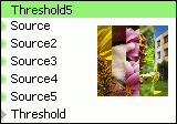 Source5 - obrazový vstup 5. Vstup není ohraničen. Na výstup je tento signál přenesen při řídicích úrovních Threshold v rozsahu 0.8..1.
