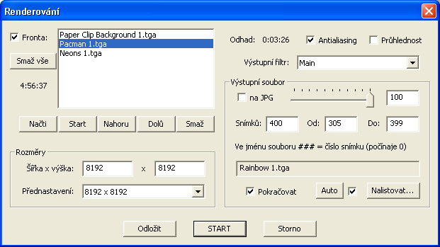 Případně, máte-li zapnutý přepínač Pokračovat, nemusí ani vadit renderujete-li obrázek, který přitom máte ve frontě. Při spuštění úkolu z fronty program zjistí, že obrázek je již hotový (podle velikosti souboru obrázku) a pokračuje následujícím úkolem.