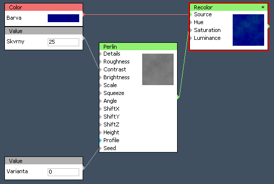 Nejdříve si připravíme podkladovou barvu pozadí. Základní barvu zadá uživatel pomocí vstupního filtru Color (skupina Vstupy/Výstupy, popiska Barva). Základní barvu vedeme do vstupu Source filtru Recolor (skupina Barva). S jeho pomocí budeme pozadí mírně přebarvovat, aby nemělo příliš nudnou jednotvárnou barvu. Přebarvování provedeme filtrem Perlin (skupina Výplně). Na vstup Countrast filtru Perlin připojte vstupní filtr Value s popiskou Skvrny. S jeho pomocí budeme řídit intenzitu přebarvování. Na vstup Seed připojte filtr Value s popiskou Vairanta a nastaveným Maximem na 1000. Bude sloužit uživateli k volbě různých variant. Výstup filtru Perlin přiveďte do vstupu Hue filtru Recolor. Vstup Hue slouží ke změně barevného tónu barvy. Tím, že na vstup Hue přivedeme výstup z filtru Perlin, bude se tón pozadí přebarvovat náhodně v různých místech obrazu.