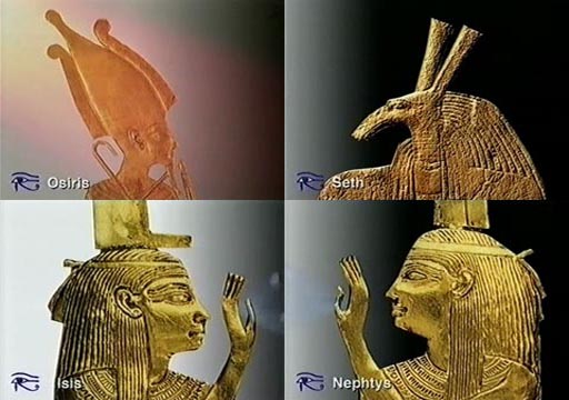 V mýtickém příběhu byli vládci Egypta Osiris a Isis. To oni stanovili zákony. To oni byli nástroji své civilizace. Učili respektu a hledání Boha. Po dosažení tohoto cíle Osiris hledal další dimenze, další pravdy a znalosti, a království - symbol mysli - přenechal Isidě, své ženě a sestře. Seth, jeho bratr, temná zvířecí síla, si chtěl přivlastnit království, mysl člověka i Isis, do které se bláznivě zamiloval. Když se Osiris vrátil, Seth ho společně s 72 šlechtici pozval na banket. Připravil speciální dřevěný sarkofág, přesně odpovídající rozměrům Osirida. Prohlásil, že jej věnuje tomu, komu padne. Jeden za druhým si jej zkoušeli. Jakmile si do něj lehl Osiris, přiklopili jej víkem, zalili olovem a hodili do Nilu. Seth, který představuje zvířecí a vášnivou podstatu každého živočicha, se ujal vlády nad myslí a omezil ji jen na tělesné pocity a vášně.