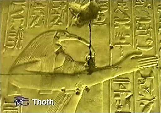 Thóth, muž s hlavou Ibisa, symbolizuje božské slovo, které pojmenovává vše živé. Představuje mnohočetné principy jediného Boha, který tím, že pojmenuje, stvoří božskou bytost. Thóth drží Knihu osudu, kam zapisuje jména každé duše. Jména, podoby a rozdílné osobnosti v řetězci reinkarnací vedoucích člověka k nesmrtelnosti. Každá duše obdrží tělo, se kterým prochází životem, a jméno, v tomto případě Sethi I., který je dočasně faraónem. Objevil se na určitém místě a za určitých okolností, aby pokračoval ve svém vzdělávacím procesu. Thóth do své knihy zapisuje jméno doprostřed smyčky, kterou Egypťané nazývali kartuš. Každá další smyčka se připojuje k té základní a představuje nejnovější osobnost, do které se vtělila věčná duše. Jméno je vibrací božského světa, který dává tělu tvar a určuje, jaká bude dočasná osobnost duše. V každém životě máme rozdílnou osobnost, která představuje lekci a osud, určující okolnosti, jež musíme prožít, abychom se poučili. Thóth je božským písařem. Archivuje lekce, které se má vtělená duše naučit v Knize osudu a v okamžiku smrti člověka zaznamená, čeho se mu podařilo dosáhnout. Protože je zodpovědný za slova, je považován za vynálezce jazyka, písma a intelektu, který hodnotí, porovnává a analyzuje.