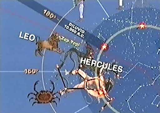 Podívejme se, kde se dnes nachází Sluneční soustava. Na nultém stupni ekliptiky. Na konci věku Ryb a na počátku věku Vodnáře. My se teď vrátíme o 180°. Do sluneční soustavy před 12 960 lety, o 180° nazpět, do souhvězdí Lva. Vědci tvrdí, že v té době končil playstocen, roztály ledovce a došlo k potopě světa. Tvar Sfingy spojuje dva symboly, jež představují zodiakální a polární konstelace - lva a člověka - a my díky tomu můžeme určit přesné datum.