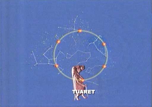 Nazvali ji souhvězdím Tuaret, jeho symbolem byla červená těhotná hrošice. Dnes se stejné seskupení hvězd nazývá souhvězdí Draka a jeho symbolem je saň. Nejjasnější hvězdou souhvězdí byla Alfa Draconis, nacházející se v té době přesně nad otáčivou osou Země. O 4 320 let později ji nahradila Polárka, která dnes vede naše mořeplavce.