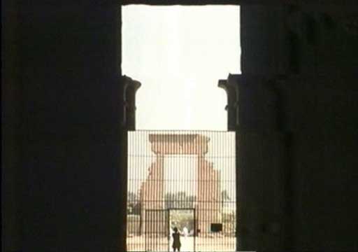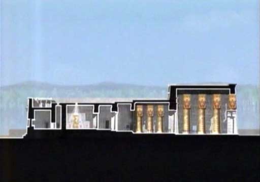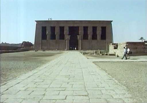 Skrz vstup můžeme vidět šest Hathořiných sloupů ve fasádě obrovského hlavního chrámu orientovaného na sever a určeného ke studiu hvězd.