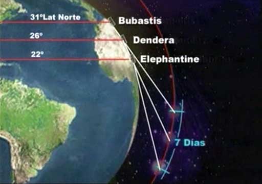 Náboženský komplex v Dendeře leží na 26° severní šířky. Byl zde počáteční bod starodávné cesty k Rudému moři. Později byly o několik kilometrů jižněji postaveny Théby.
