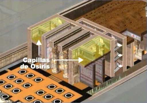Přes terasu se dostaneme ke dvěma kaplím zasvěceným Osiridovi, božskému principu evoluce všech lidských bytostí, prostřednictvím reinkarnací. Je tu znázorněn mýtus o jeho osobě. Jeho bratr Seth se chtěl zmocnit jeho trůnu a také jeho ženy Isis. Proto rozsekal jeho tělo na 14 dílů a rozeslal je po celém Egyptě. Na reliéfech je znázorněna Isis ve formě letícího jestřába poté, co se jí podařilo rozdělené tělo znovu sestavit. Usedá na Osiridův penis, otěhotní a porodí syna Hóra.