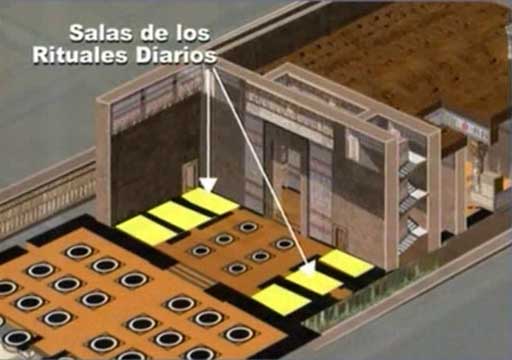 Kolem této haly se nachází šest hal určených pro každodenní rituály. V první byly uskladněny kultovní předměty. Místnost očisty s dveřmi k posvátnému jezírku používali kněží k očistným rituálům za úsvitu. Chrámy měly posvátné jezero vyhloubené až k hladině podzemní vody, obložené kameny a doplněné několika schodišti, po kterých sestupovali kněží do vody a omývali se před bohoslužbami v chrámu. Následuje místnost bohoslužeb. Ústí do chodby s točitým schodištěm vedoucím na terasu, kde kněží v noci zaznamenávali hvězdnou oblohu. Nalevo se hala otevírá do volného prostoru, kde duchovní vůdci každý den přijímali dary, které jim nosil lid. Potrava a zvířata určená k obětování byla skladována a připravována v dalších dvou místnostech.