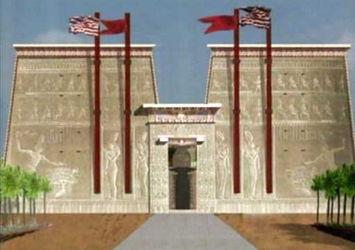Dvě věže ve fasádě chrámu vymezovaly jižní polární hvězdu. Věže jsou svými přesnými zrcadlovými obrazy, včetně vytesaných reliéfů. Symbolizují symetrii v asymetrickém vesmíru, která umožňuje pohyb. V čele stojí faraón se žezlem a hrozí nepřátelům Egypta. Tento symbol se v egyptské historii častokrát opakuje. Na překladu je znázorněn okřídlený disk se dvěma hady. Hieroglyfy na věžích popisují krajinu s horami rámujícími slunce. Pylon, nebo fasáda, je 35 m vysoká, tedy jako 10patrová budova, a doplňují ji 4 velmi vysoké sloupy s dlouhými, jasně zbarvenými vlajkami, vlajícími ve vzduchu.