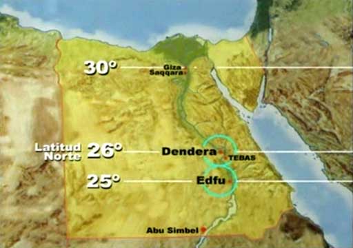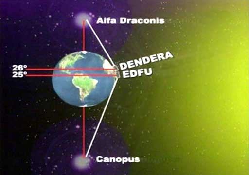 Chrámy od sebe dělil přesně 1° severní šířky. Dendera leží na 26° a Edfu na 25°, severně od zemského rovníku. Díky tomu mohli kněží zaznamenávat pro ně tak významné pohyby hvězd, které popisovaly vztahy mezi souhvězdími a energie, jež ovládaly evoluční cestu člověka. Změna věku z jednoho zodiakálního znamení v druhé určovala fáze, ve kterých kněží odhalovali tajemství vesmíru, přesouvali hlavní město říše a dokonce měnili jména jejich faraónů. Ve všech chrámech byl hlavní vstup nasměrován k části oblohy, kde se pohybovala jedna z hvězd, ohňů na obloze, jejíž pohyb musel být pečlivě zaznamenáván. Hórův chrám v Edfu, byl orientován k jižnímu pólu, ke hvězdě Canopus. Chrám Hathory v Dendeře byl naopak otočen k severnímu pólu a ke hvězdě Alfa Draconis. V Hórově chrámu v Edfu se oslavovalo jeho zrození 3 měsíce po letním slunovratu. V Hathořině chrámu se slavilo obnovení života a plodnost, způsobená záplavami na Nilu, o letním slunovratu. Druhý chrám v Dendeře, zasvěcený bohyni Isis, byl obrácen k Síriovi, její personifikaci na obloze. Východ Síria o letním slunovratu oznamoval příchod záplav na Nilu a za úsvitu oznamoval východ slunce. Příchod záplav znamenal konec egyptského solárního roku a v Dendeře začali oslavovat bohyni Hathor, sílu, jež obnovuje život, a také Isis, sílu přinášející vodu, tak důležitou pro Egypt.