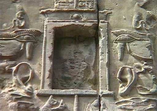 Na této stěně najdeme vytesané symbolické dveře, které existují v mysli každého člověka. Těmito dveřmi lidé komunikují s vyššími dimenzemi. Touto symbolickou cestou mezi oběma svatyněmi se ubírali žáci, aby postoupili do další úrovně svého tréninku. Na levé straně je Sobek se žezlem, zakončeným podobiznou lva, nejdokonalejšího zvířete. Na pravé straně je Hór s nožem s lidskýma nohama, symbolem cesty plné utrpení a sebekontroly každého člověka vedoucí k získání vědomostí jeho učitele. Mezi nimi se nachází chvalozpěv korunovaný Maat, symbolem pořádku a rovnováhy mezi oběma protichůdnými silami. Sobek představuje materialismus a Hór vědomou spiritualitu. Maat představuje řád vesmíru. Kolem ní jsou přes sebe vytesána čtyři zvířata, symbolizující čtyři faktory. Lev, sokol, býk a vícehlavý had. Jsou to síly osudu, jež působí na každého člověka. Kuriózně stejné symboly později použili křesťané k reprezentaci čtyř evangelistů.