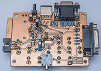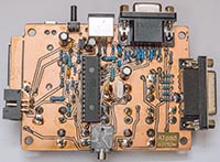 Výroba plošného spoje: Použijte oboustrannou desku plošného spoje o rozměru 10x15 cm. Pro ni jsou připraveny zaměřovací kříže v rozích předlohy spoje. Předlohu vytisknete na inkoustové nebo laserové tiskárně. Je potřeba použít průhlednou fólii pro inkoustovou nebo laserovou tiskárnu. Na jiné fólii barva nemusí držet. Každou stranu předlohy vytiskněte 2x, zrcadlově obráceně. Oba výtisky přiložte k sobě, přesně je sesaďte (podle krytí nejjemnějších částí spoje) a slepte izolepou. Přiložte předlohu tiskem dolů na plošný spoj (proto zrcadlově obrácený tisk), zaměřovací kříže v rozích usaďte přesně na rohy spoje 10x15 cm. Spoj osviťte UV zářivkou nebo UV LEDkami. Přesnou dobu osvitu si předem vyzkoušejte na proužku plošného spoje. Pro osvitku s 15 UV LEDkami je při vzdálenosti 30 cm doba osvitu asi 8 minut. Po osvitu jedné strany desku otočte a osviťte ji s použitím druhé předlohy (pozor na správnou orientaci stran k sobě). Spoj vyvolejte v 1% roztoku hydroxidu sodného (Tesco, drogerie) a vyleptejte v 7% roztoku kyseliny solné (PeMi, OBI) s 1% peroxidu vodíku (Barvy Laky).