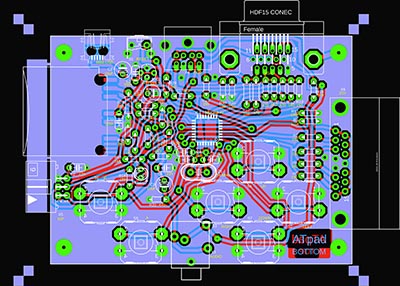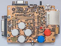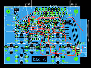 Odpory R7 až R12, R19, R30 a R31 jsou odporové děliče, ke změně výstupní úrovně procesoru na video signály RGB. Odpory R19, R30 a R31 nejsou nutné. Byly přidány ve snaze zlepšit impedanční přizpůsobení výstupů k 75-ohmovému vstupu televizoru, aby se zlepšily zákmity na hranách obrazu. Zákmity se moc nezlepšily (problém bude asi někde jinde) a budete-li chtít tyto 3 odpory vypustit, v tom případě změňte odpory R7 až R12 na hodnoty 680 a 1K5. Odpory R21 a R29 vytváří napěťové úrovně potřebné pro signály SWITCH a BLANK pro SCART konektor. Pro výstup na TV nebo VGA lze použít jak X4 RGB konektor, tak X2 VGA konektor. Oba konektory obsahují všechny potřebné signály. Audio výstup je přiveden nestandardně na pin 14 VGA konektoru (běžně používaný pro VSYNC). Díky vstupní impedanci 75 ohmů je zvukový signál utlumen a nebude nesprávně považován za VSYNC signál. Při zasunutí konektoru do X3 AUDIO výstupu je signál od VGA konektoru odpojen, aby nebyl VGA monitorem utlumen. Synchronizační signál je na oba konektory veden jako synchronizační směs (HSYNC i VSYNC pohromadě), který podporují i VGA monitory. Je možné neosazovat konektor X4 RGB a používat pouze X2 VGA konektor - snáz se letuje (větší vzdálenost mezi piny) a s mini-DIN konektorem se špatně manipuluje (příliš jemný konektor na příliš silný kabel)..