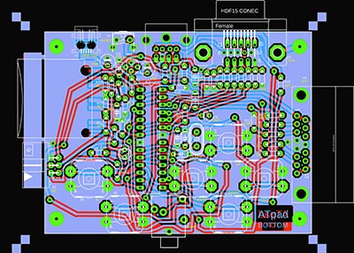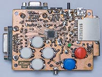Plošné spoje jsou navrženy jako oboustranné, bez prokovených děr, s nutností několika propojek mezi horní a spodní vrstvou. Spodní vrstvu je možné nahradit drátovými propojkami (spoje jsou vedeny především v horní vrstvě). Spoje jsou vytvořené ve free verzi Eagle, proto jsou limitovány rozměrem 10x15 cm. Současně je to i rozměr vhodný pro použitou krabičku. Shora jsou osazena tlačítka, SD konektor, USB konektor a procesor v TQFP verzi. Použijete-li tlačítka s aretačními výstupky, doporučuji výstupky upilovat, aby tlačítka dolehla těsně na plošný spoj - vnitřní výška krabičky doléhá těsně na tlačítka, při ponechání výstupků by tlačítka překážela.
