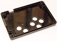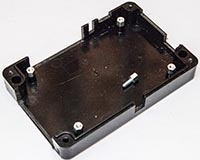 Ke dnu je deska uchycena pomocí distančních sloupků o délce 5 mm a se závitem M3. Závit sloupku je nutné trochu upilovat, aby nebyl delší než sloupek krabičky. Závit M3 drží ve sloupcích krabičky dobře, ale lze snadno strhnout neopatrným šroubováním sloupku.