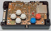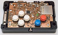 Konektory na dolní straně desky přiléhají těsně na dno krabičky. Horní víko krabičky doléhá těsně na osazení hmatníků tlačítek. Pozorujete-li, že tlačítka nereagují na stisk (necvakají), jsou zamáčknutá víkem krabičky. V tom připadě je nutné buď podložit víko krabičky, nebo zvětšit otvory pro tlačítka (aby se vešla i s jejich osazením), nebo ze spodní strany víka rozšířit otvory vyfrézováním drážky (to je použito na fotografiích).