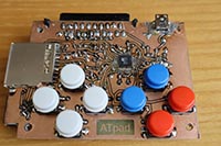 Procesor je vybavený resetovacím tlačítkem S1, kterým se lze dostat z programu do bootloaderu. Konektor S5 ISP je programovací, slouží k naprogramování procesoru. Použijte některý standardní programátor pro AVR procesory s 6-pinovým ISP konektorem. Současně jsou programovací signály ISP přivedeny na SD kartu, přes odporové děličky sloužící k přizpůsobení úrovní 5V a 3.3V. Nemusí to být nutné, ale raději nepřipojujte programátor, máte-li zasunutou SD kartu. Mohlo by dojít k poškození jejího obsahu. Konektor X1S mini-USB je napájecí konektor. Nepoužívá datové vodiče, pouze zajišťuje napájení +5V ze standardního nabíjecího zdroje (nebo z USB portu počítače). Stabilizátor IC2 připravuje napětí +3.3V pro SD kartu. Rezistor R17 zajistí úroveň HIGH na CS vstupu SD karty během startu procesoru, kdy jsou výstupy v HIGH impedanci, aby náhodným stavem signálů nedošlo k modifikaci obsahu SD karty. Konektor SD karty nevyužívá signály vložení karty ani ochranu proti zápisu (v software ATpadu není ani zápis na kartu implementován). K CS signálu SD karty je připojena indikační LED dioda, monitorující aktivitu čtení z SD karty, a také jako signalizační LED programu.